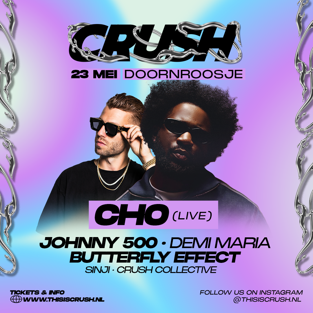 Met CHO (live) als headliner brengen we een line-up die precies klopt voor de eerste keer in Doornroosje: CHO, Johnny500, Butterfly Effect, Demi Maria, Sinji en CRUSH Collective